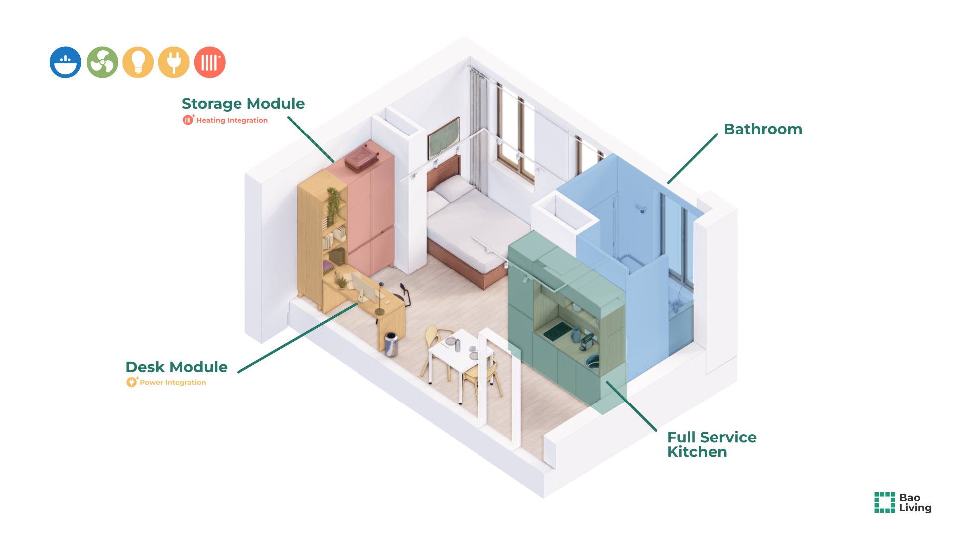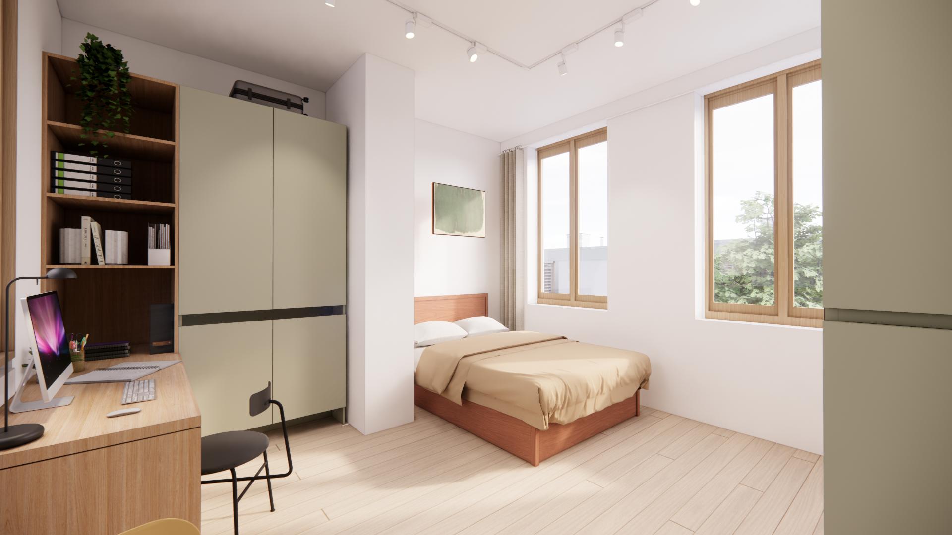 In dit project in het centrum van Mechelen wordt een bestaand gebouw omgevormd tot tien moderne studentenkamers van ongeveer 22 m². Elke kamer beschikt over een eigen badkamer, terwijl een gedeelde keuken en leefruimte voorzien worden in het souterrain. De verwarming gebeurt via een centraal systeem op basis van warmtepomptechnologie. In plaats van zichtbare radiatoren of vloerverwarming, worden convectoren volledig geïntegreerd in de SAM-meubels. Zo blijft de muuroppervlakte vrij en kan elke kamer functioneel én flexibel worden ingedeeld, zonder in te boeten op comfort.