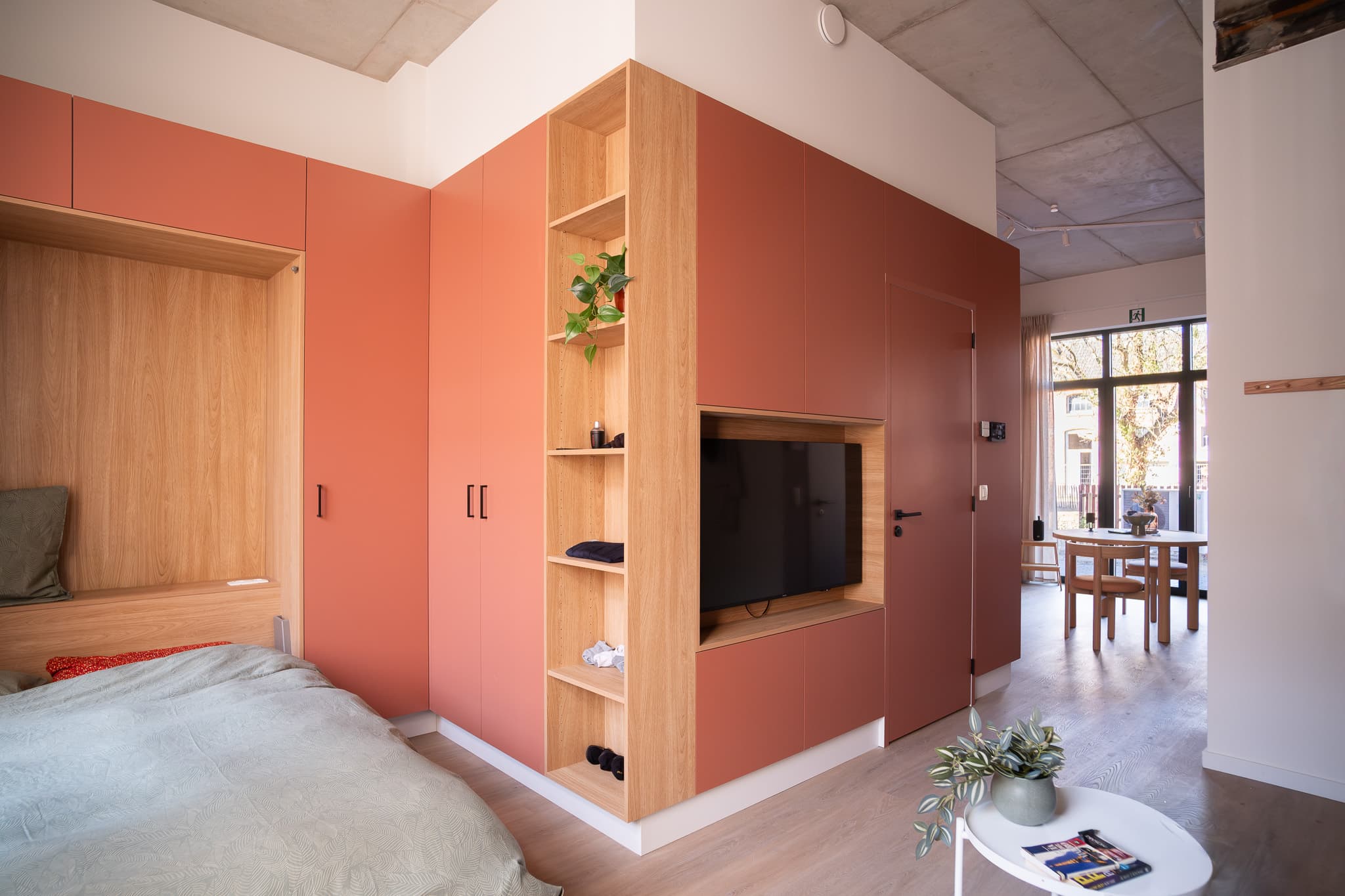 Door de implementatie van onze Slimme Aanpasbare Module hebben we opnieuw tot 20% extra leefruimte gerealiseerd. Dit komt door een slimme integratie van de verschillende technieken in onze meubelelementen en het toepassen van innovatieve elementen zoals de opklapbare bedmodule en een geïntegreerde wastafeloplossing in de badkamer.